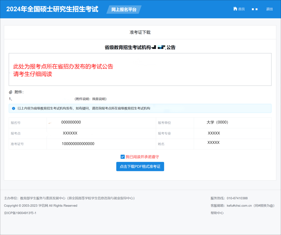 各位考生請注意,這個頁面上的提示一定要認真閱讀,然后勾選“我已閱讀并承諾遵守”后,再點擊“下載PDF格式準考證”的按鈕。