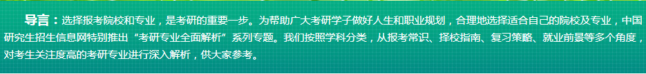 導(dǎo)言:選擇報(bào)考院校和專業(yè),是考研的重要一步。為幫助廣大考研學(xué)子做好人生和職業(yè)規(guī)劃,合理地選擇適合自己的院校及專業(yè),中國研究生招生信息網(wǎng)特別推出“考研專業(yè)全面解析”系列專題。我們按照學(xué)科分類,從報(bào)考常識(shí)、擇校指南、復(fù)習(xí)策略、就業(yè)前景等多個(gè)角度,對(duì)考生關(guān)注度高的考研專業(yè)進(jìn)行深入解析,供大家參考。